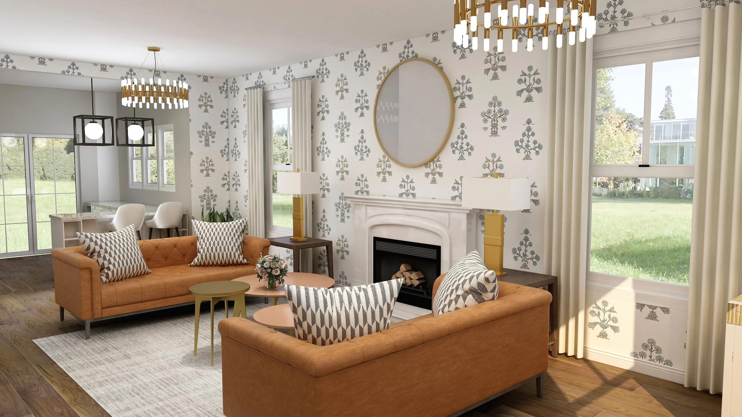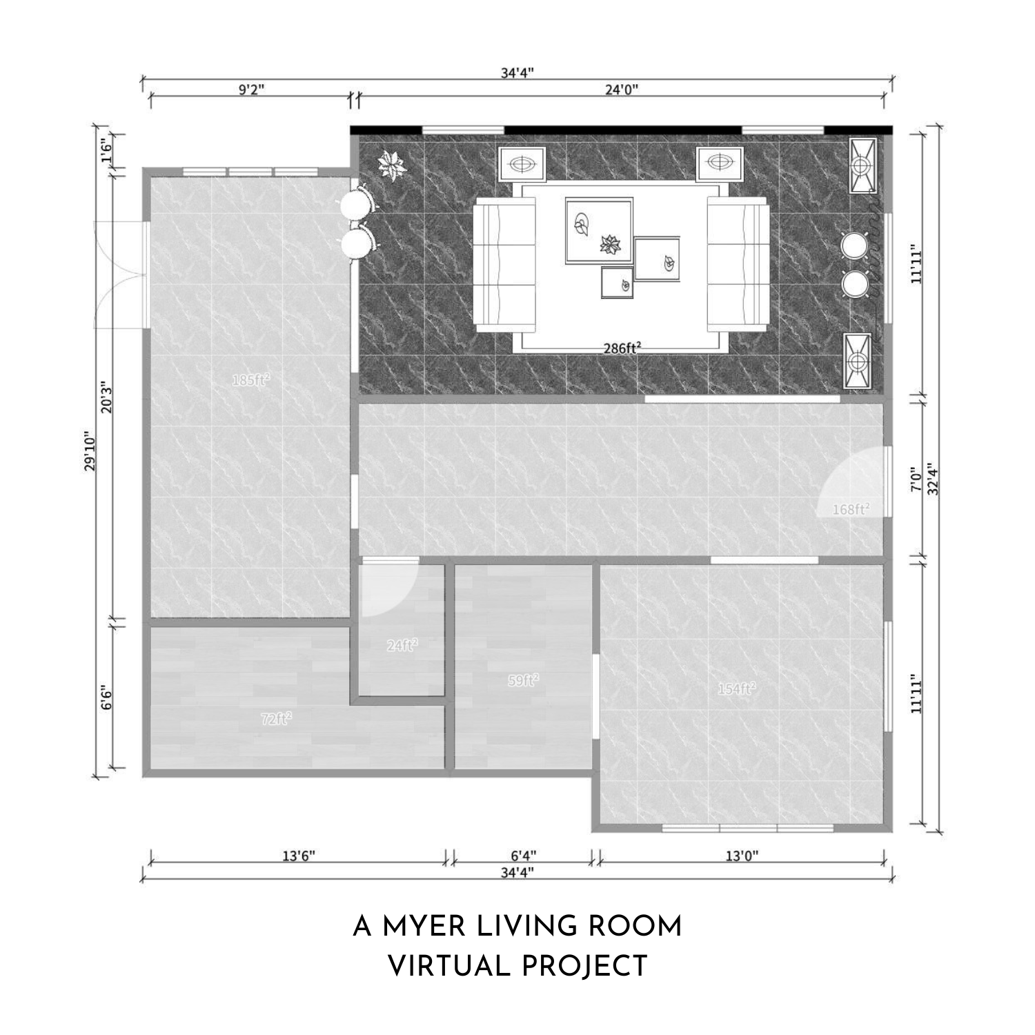 The design directive I used to develop the spatial concept was to create a single livable zone that emphasized the symmetrical architectural features of the room. Addressing the pair of overhead chandeliers created the biggest furniture placement challenge. They are a large focal point in the room and feel very far apart for a single living zone, but also too close together to effectively plan two separate living zones.