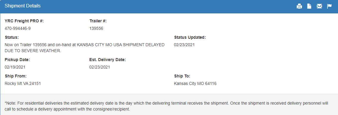 - No change in status. No new information. I communicated with the local receiving company and shared my most updated product information from them to be on the lookout for a change of status as they will be alerted before I will be that a truck is heading their way.